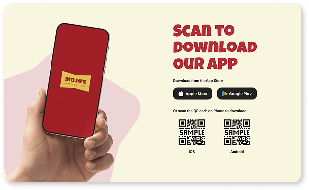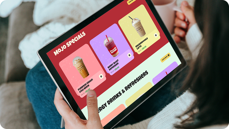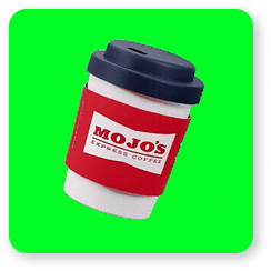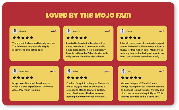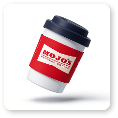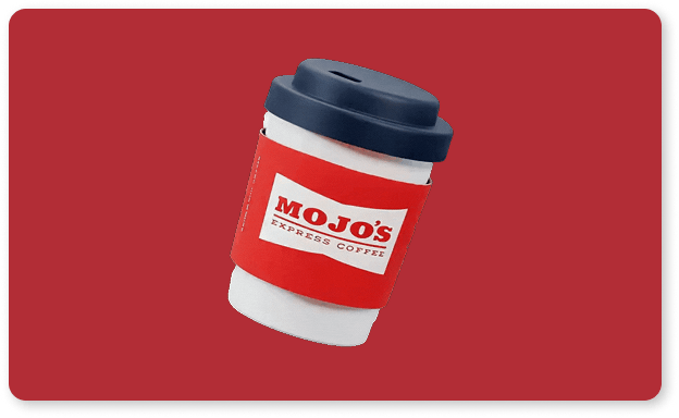 Mojo’s vibe is friendly and retro-fun, not corporate. We used vibrant colors, playful product cards, and 3D coffee graphics to match the energy of the drinks.