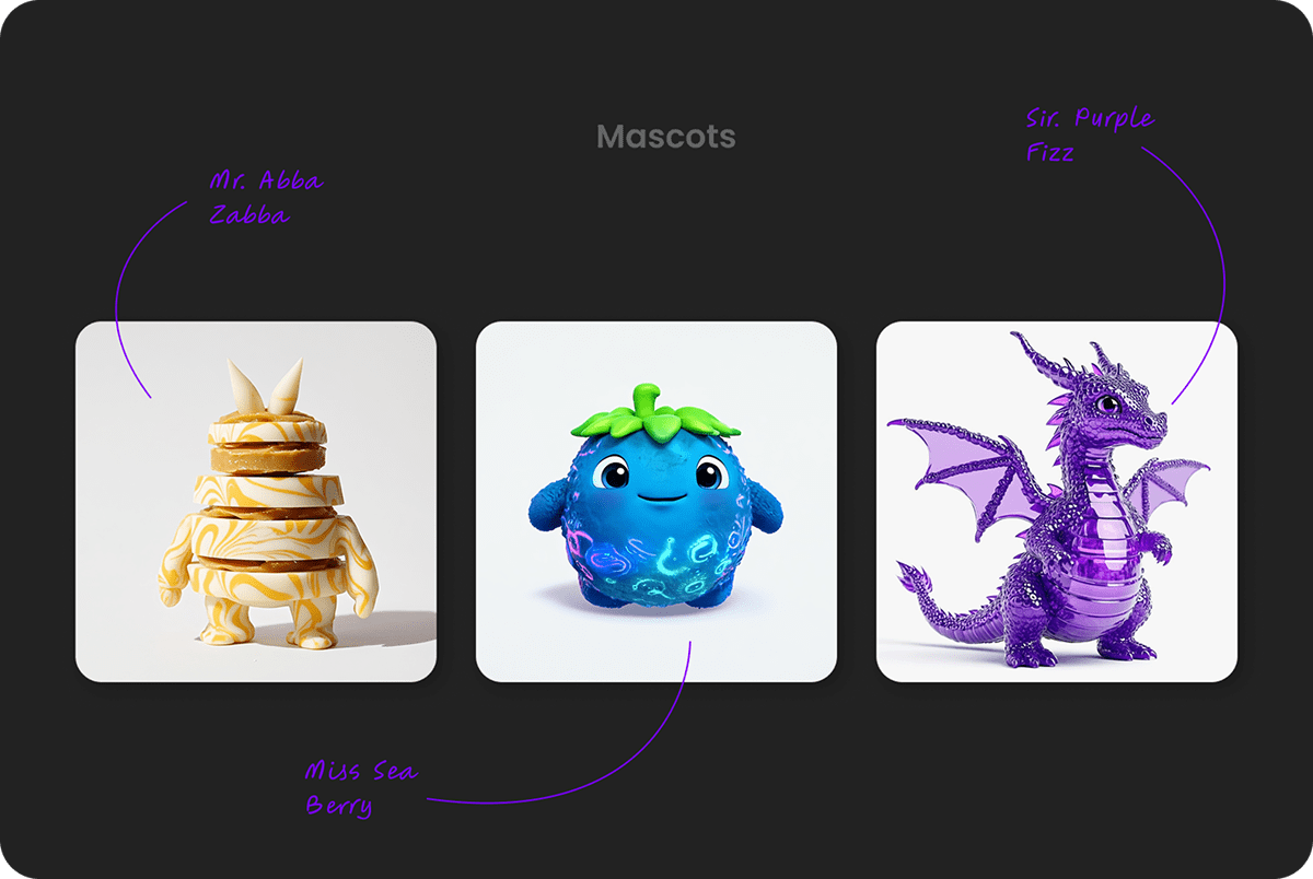 At one point, we thought- hey, what if every signature drink had its own mascot? Abba Zaba got a candy hero, Sea Monster turned into a cute chubby monster, and Purple Dragon showed up as a baby dragon.